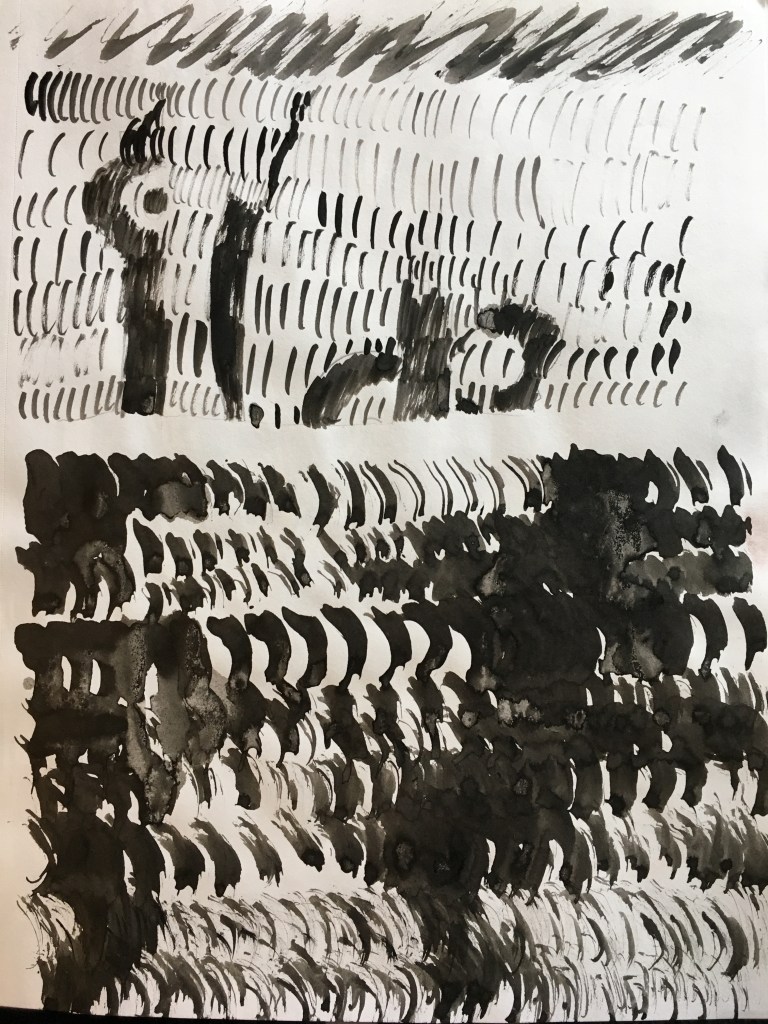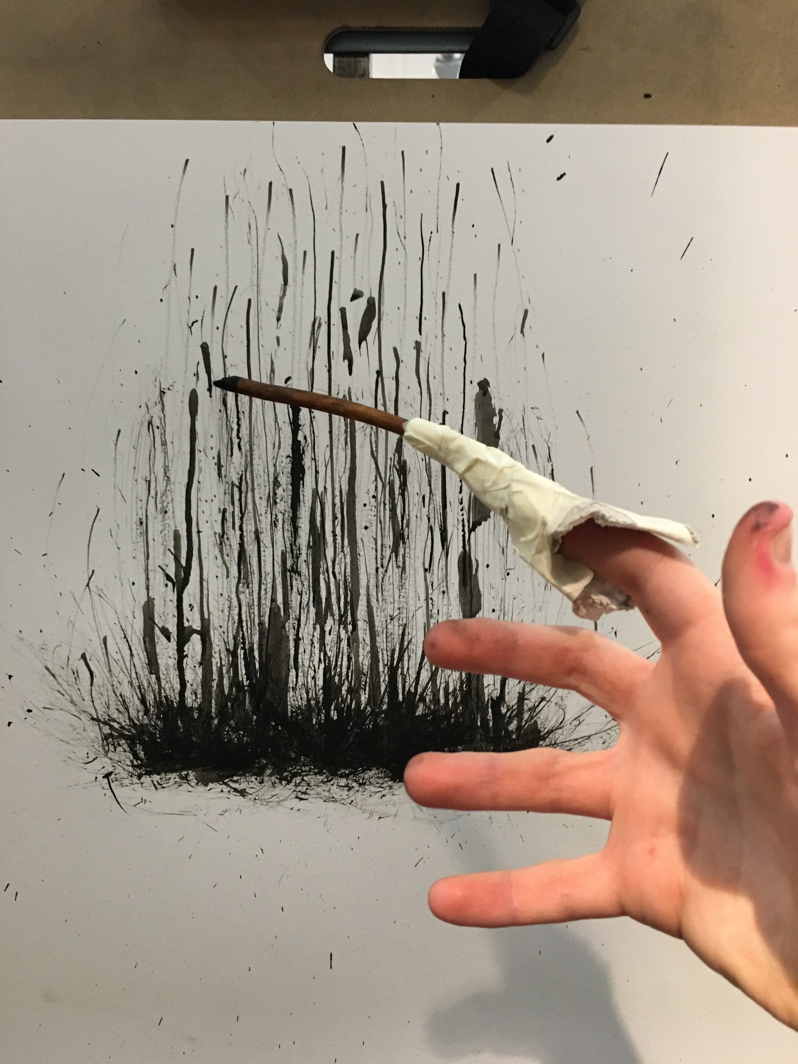 However, I found difficulty in controlling the ink flow and maintaining a consistent value between marks, even after trying several drawing implements, including both traditional brushes and homemade tools.