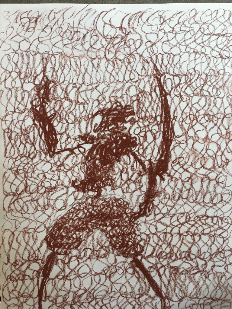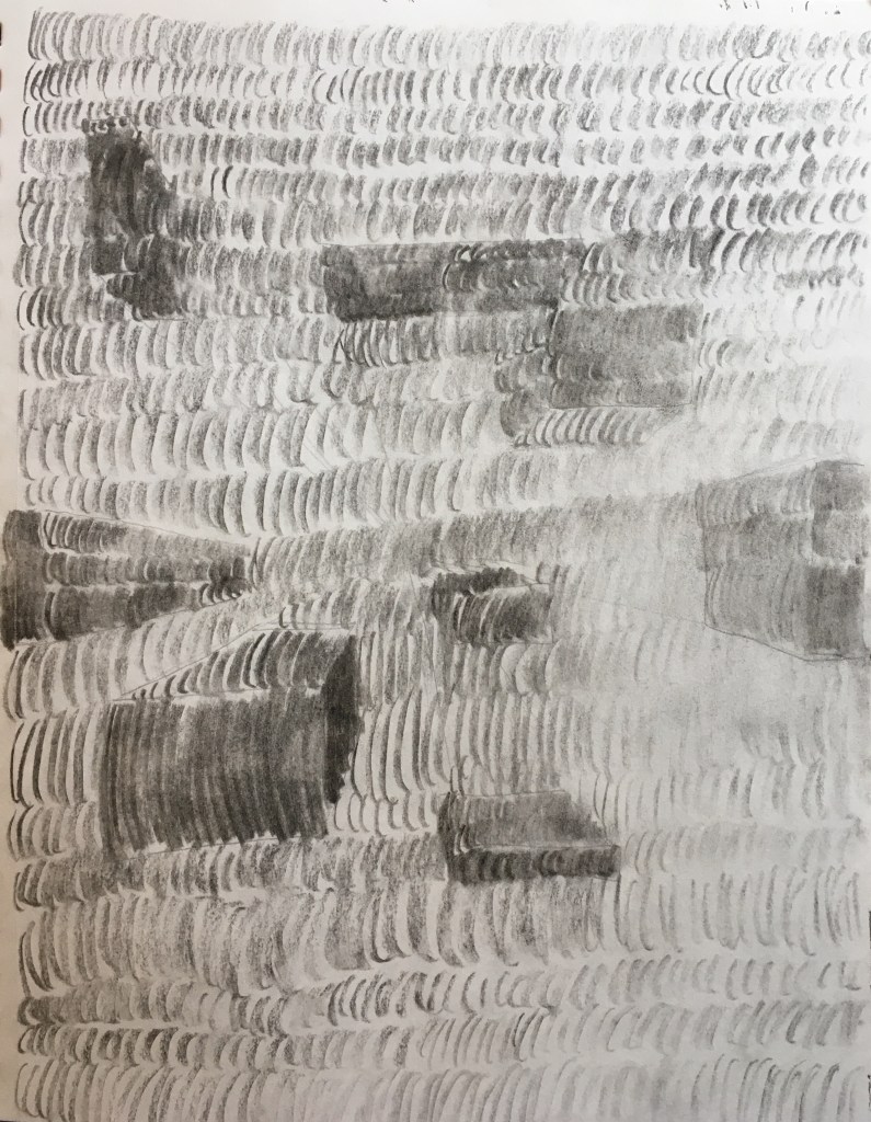I kept coming back to a repeating figure-eight pattern that was easy to use and produced an interesting “made-of-hair” look. I also chose compressed charcoal sticks for the clear values they produced and the smoothness of their strokes.