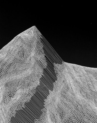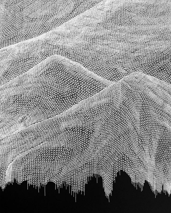 Katy Ann Gilmore has a completely different approach to mark making. Her compositions often resemble topological maps of mountains or other rough terrain. A triangular grid deformed in various ways (compressed, stretched, angled) communicates a sense of shifting mass that gives an illusion of huge, complex volumes. This is a much more precise type of mark making with a basis in mathematics. I always love to see art and math come together and these mountains are no exception.