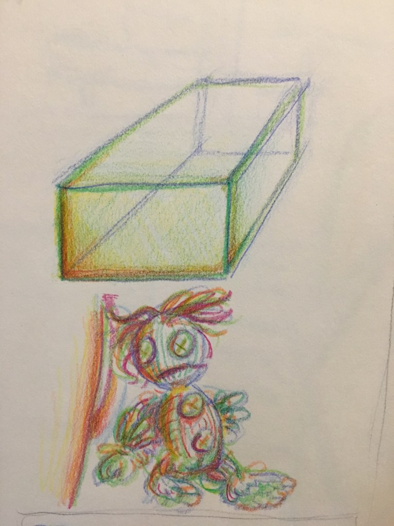 After doing a few small tests with colored pencil, I decided it would be prudent to do the larger drawing with something a little less fine. Here’s a test drawing i did of the same composition using crayons: