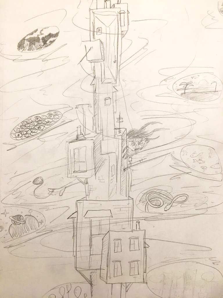 My initial concept was a tower surrounded by an inkstorm with various worlds and dimensions suspended within the maelstrom.