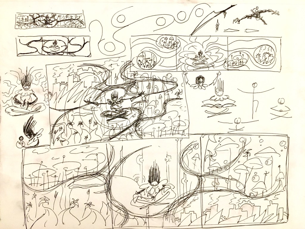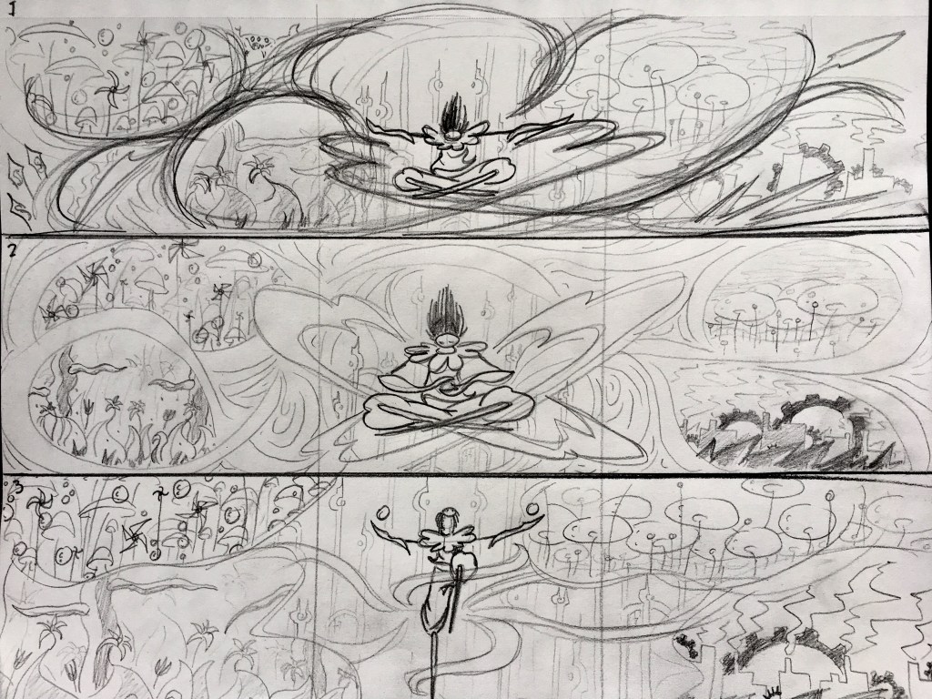 With the character and all five worlds finished, I sprayed the entire drawing with a coat of workable fixative to ensure the inking in the next phase wouldn’t damage anything.