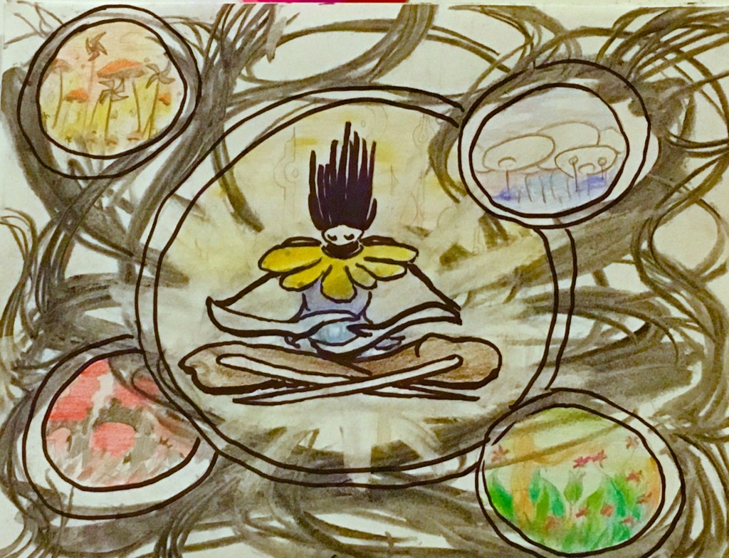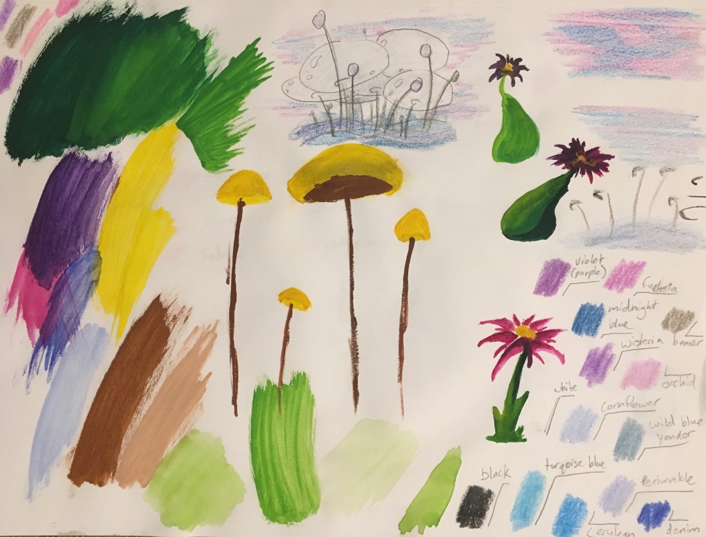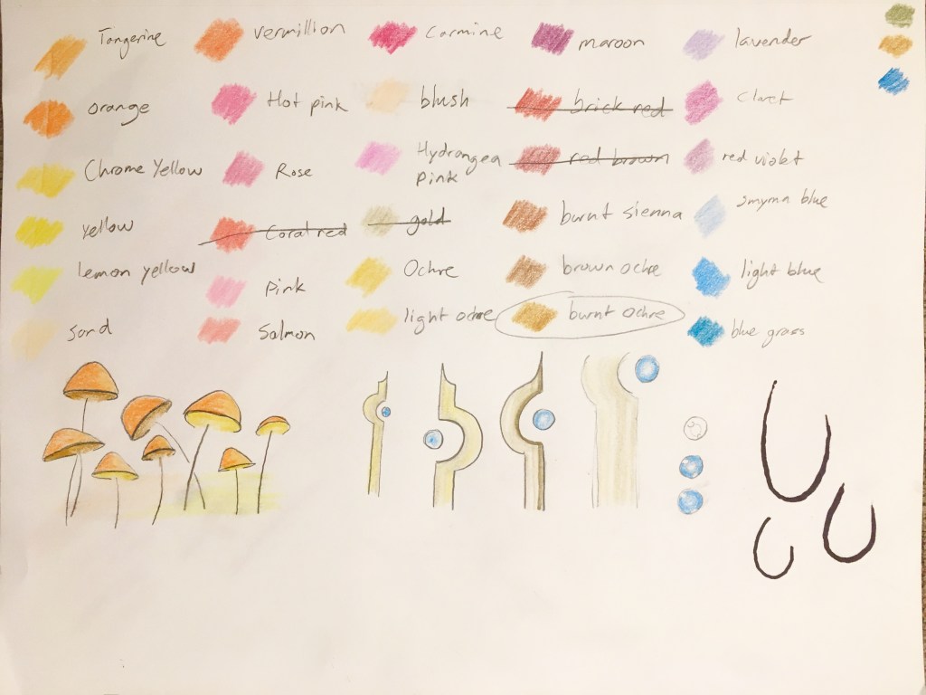 I did lots of material tests to find exactly what media and color palettes to create the worlds with. Watercolor paint for Green, crayon for Blue, colored pencil for Orange and Gold, and charcoal + sanguine for Red.