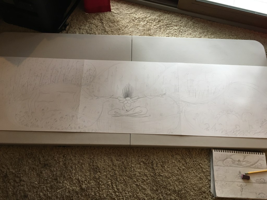 Early on, I realized I wanted to use three 19″x24″ Bristol board sheets instead of one to create this piece. Trying to fit the composition into one sheet felt too squished to me and I liked how the longer format opened it up.