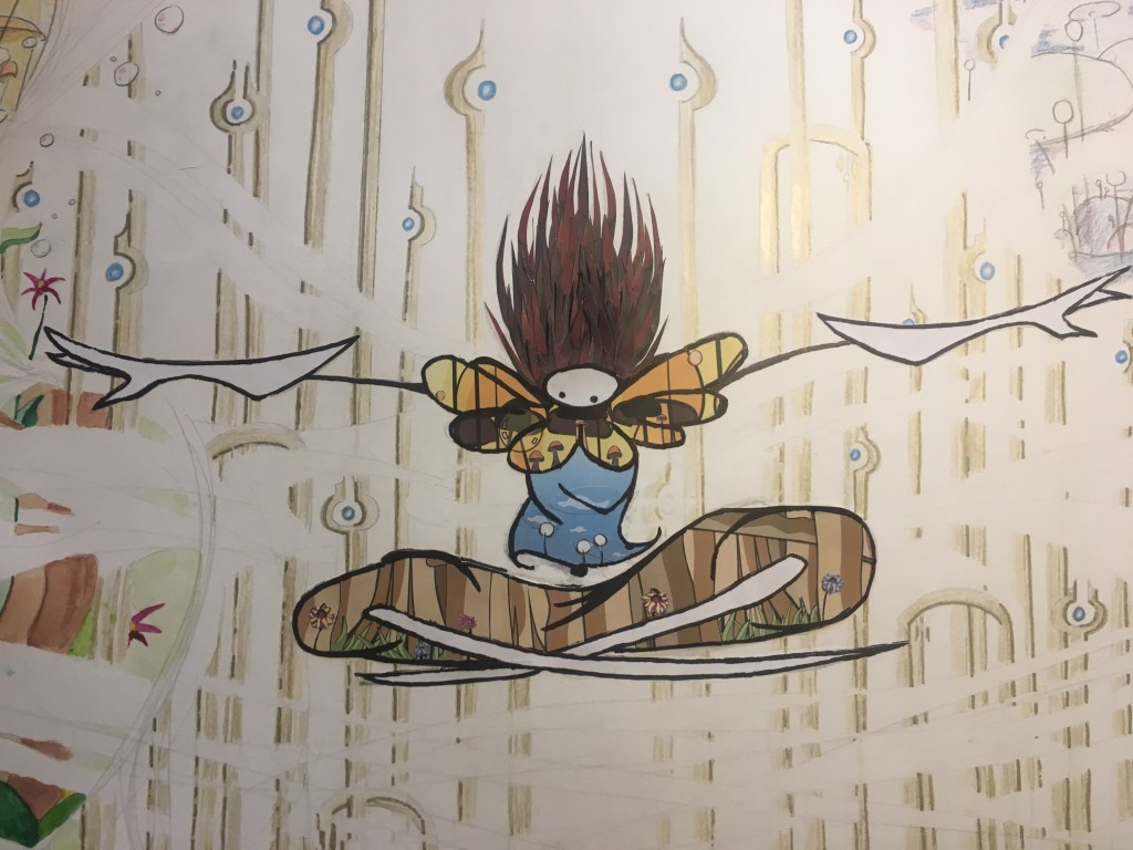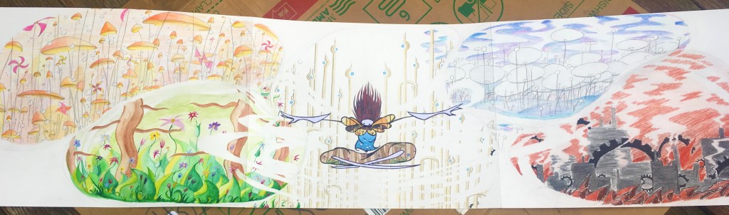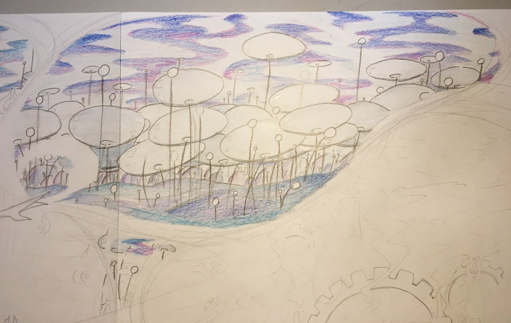 The resulting 6′ behemoth is stunning! The viewer has to physically turn their head to see everything! I’m very happy with this piece; I think the longer composition was the key and following it through really made this design work. I also played a lot with the position of each world based on their color and shape language and I think any other arrangement wouldn’t have looked so correct.