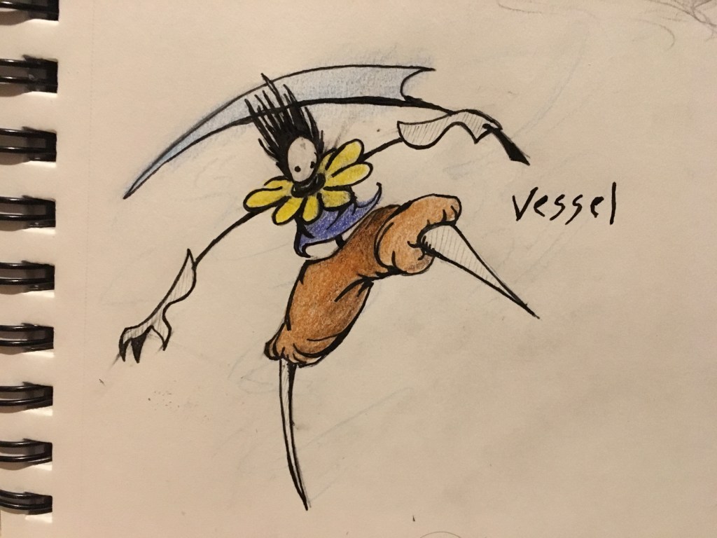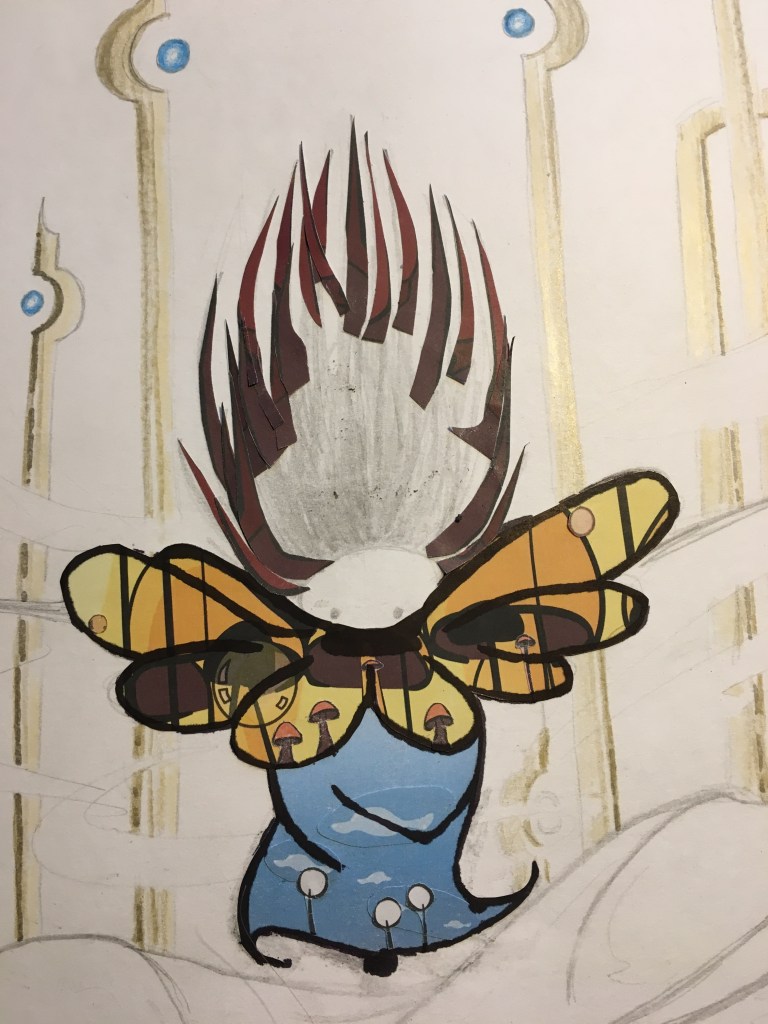 Then, before I could do Red World, I had to put in the central figure. I made Vessel using screenshots from the game in a collage. The spiky rocks of Red World became the hair, the whimsical mushroom forest of Orange World made up Vessel’s yellow collar, Blue World was a natural fit for his blue shirt, and for his baggy pants, I used the trees from Green World. Vessel’s legs, gauntlets, and mask were made from plain white paper to avoid looking too busy. When the whole collage was assembled, I drew the black cartoon outlines back on using a brush tip Sharpie.