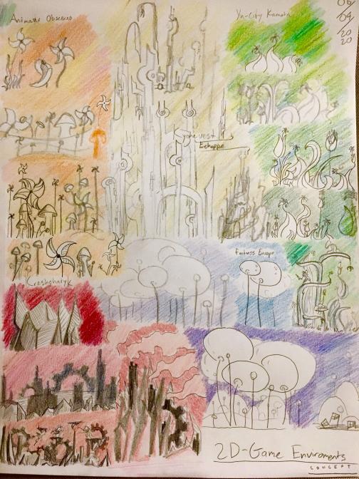 First, I painted Green World (the visuals of which were inspired by Dan Bodan’s music track “Yu City Kamata“, which was also Green World’s background music in-game). This was my first time using watercolor paints (and one of the first times I’ve painted on paper in a very long time), so I’m reasonably happy with how it came out.