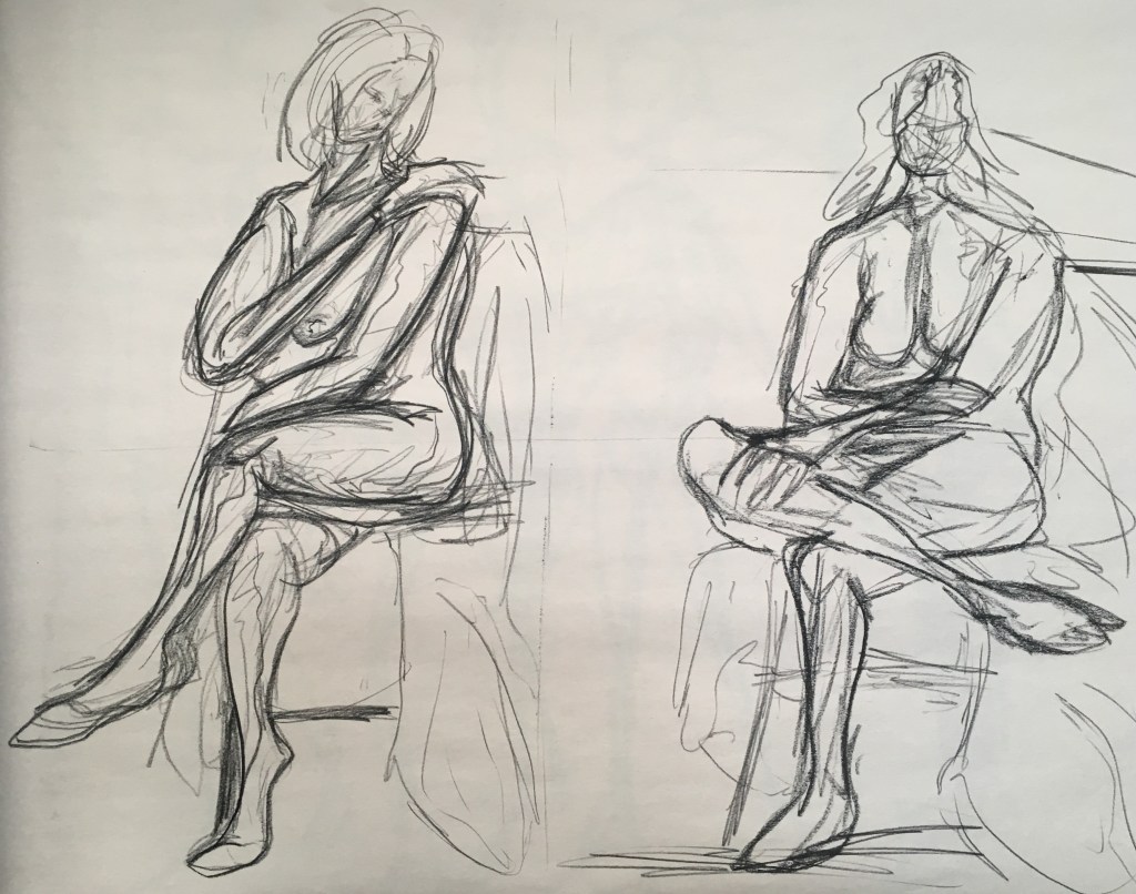 This technique creates a very unusual, chromatically abstract representation of the objects being drawn. The effect reminds me of a prism. Before committing to a larger piece in this style, I did a few sketchbook thumbnail studies of my composition.