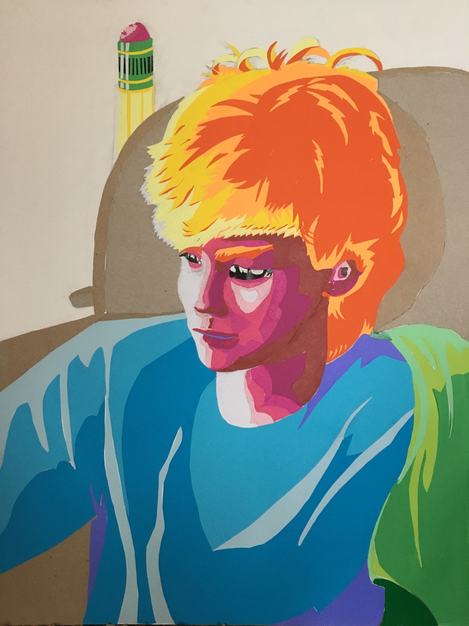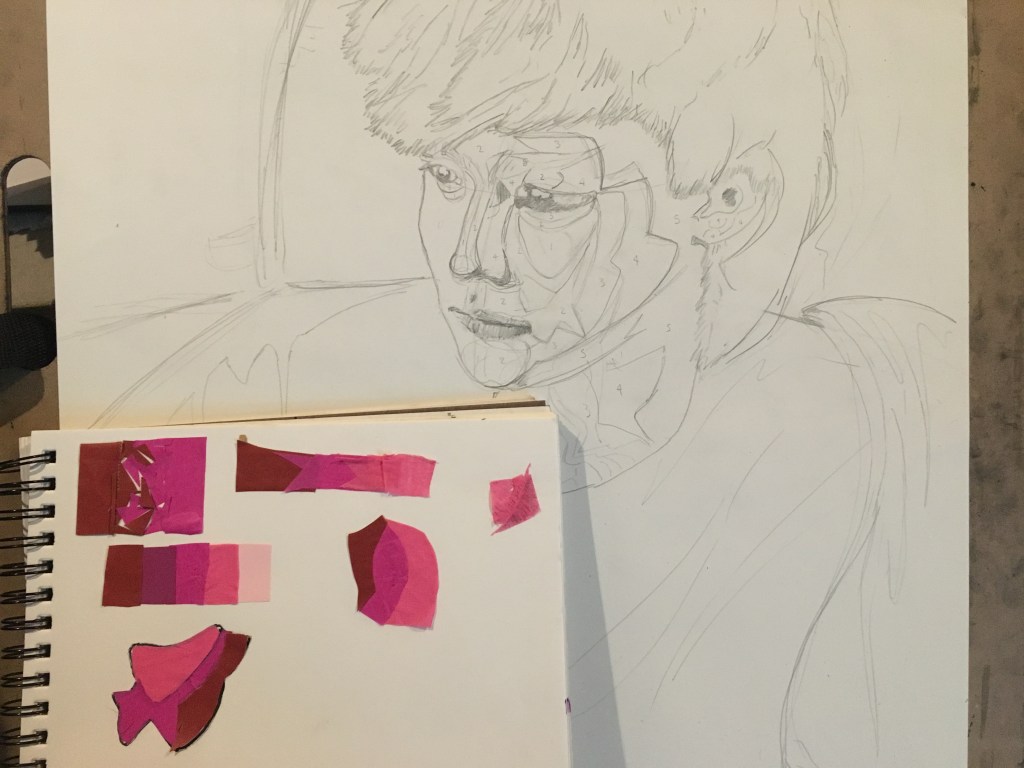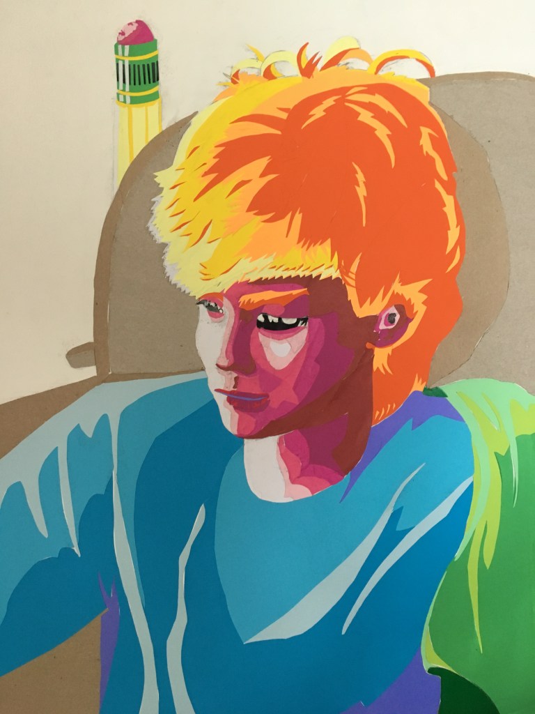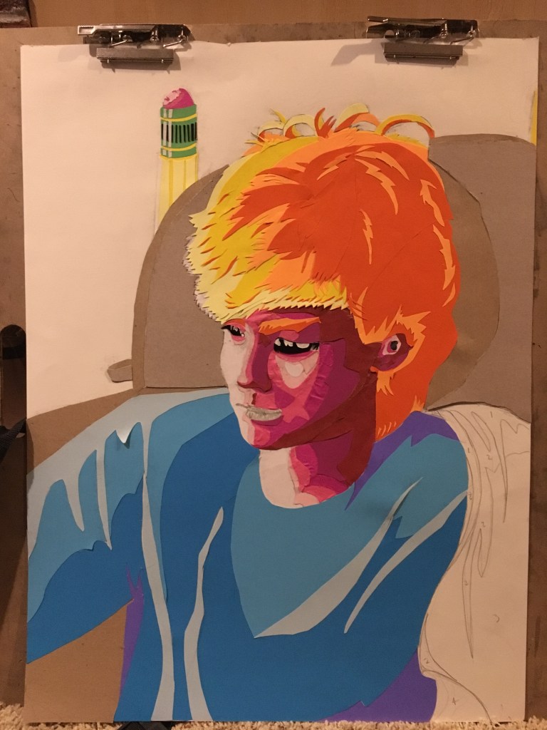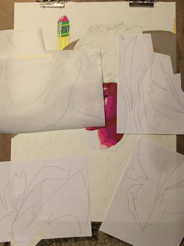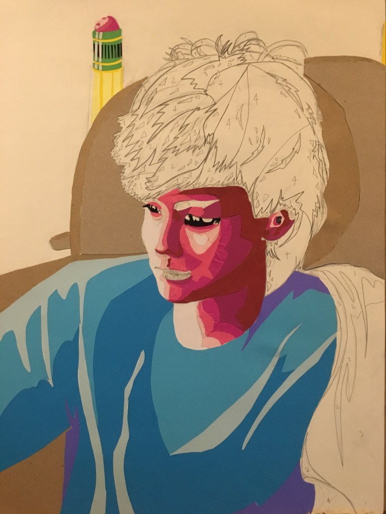 I’m really happy with the way it turned out. The key to achieving success with this style was definitely focusing early on breaking down shapes into core values. I limited myself to no more than five values on any given object (you can see some of my number notes on the sketch and stencils in previous pictures). This was partly because of limited materials to make the collage with, but also because it forced this “toony” style, which fits Lance very well. I also kept almost all the warm colors in the image focused on the head (which is also where the most detailed areas are) to ensure that the face itself remains the focal point of the artwork.